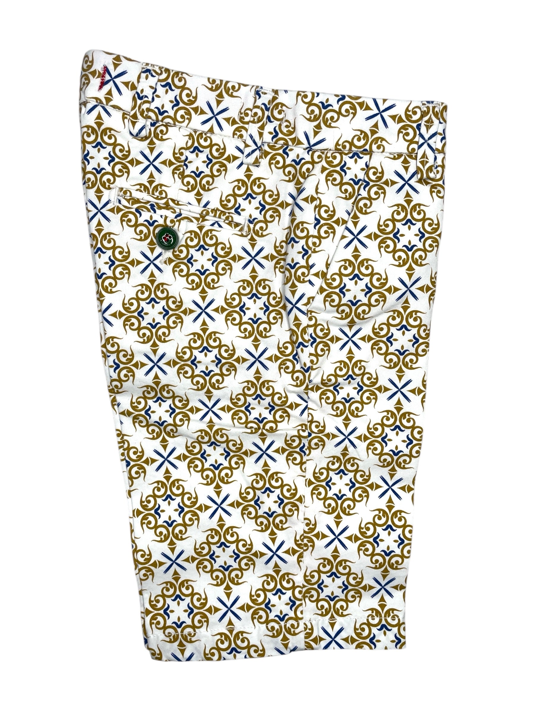 Questo bermuda è realizzato in 97% cotone e 3% elastan gabardine. Presenta un design a tasca america, una chiusura centrale con cerniera e bottone rosso, e tasche posteriori a filetto. Il capo ha un fit regular e una fantasia.