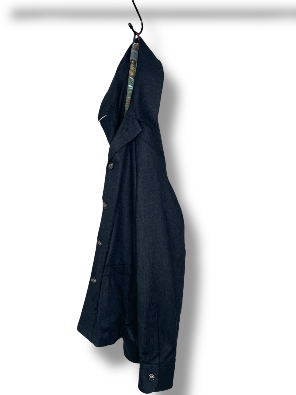 Giacca in lana, collo francese, chiusura 4 bottoni, due tasche a toppa fondo giacca, regular fit.