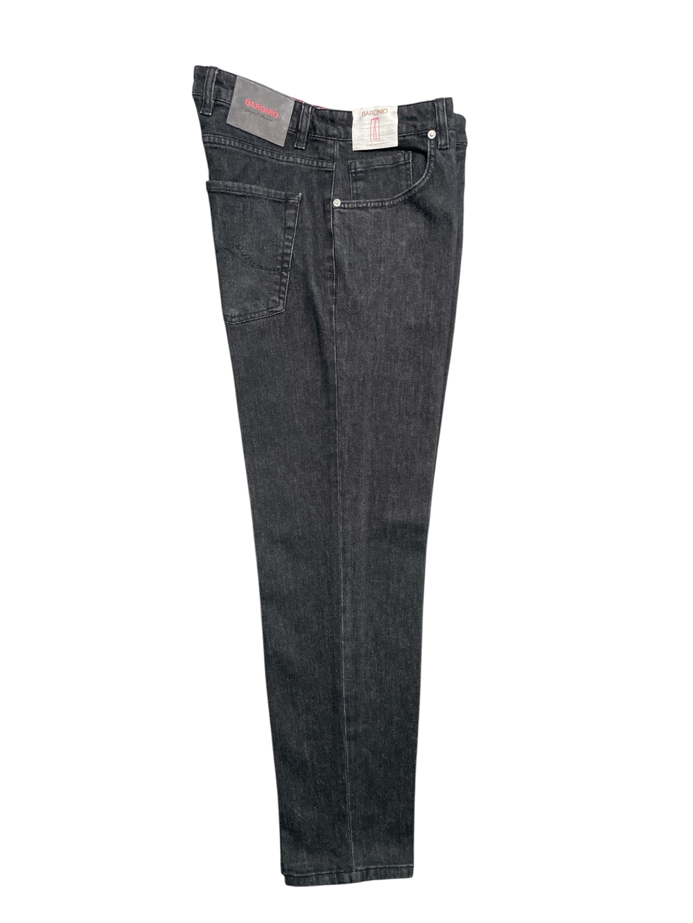 Denim 5 tasche, black wash, cuciture di colore nero, passanti per cintura, salpa grigia in pelle scamosciata con logo baronio, chiusura con zip, regular fit.