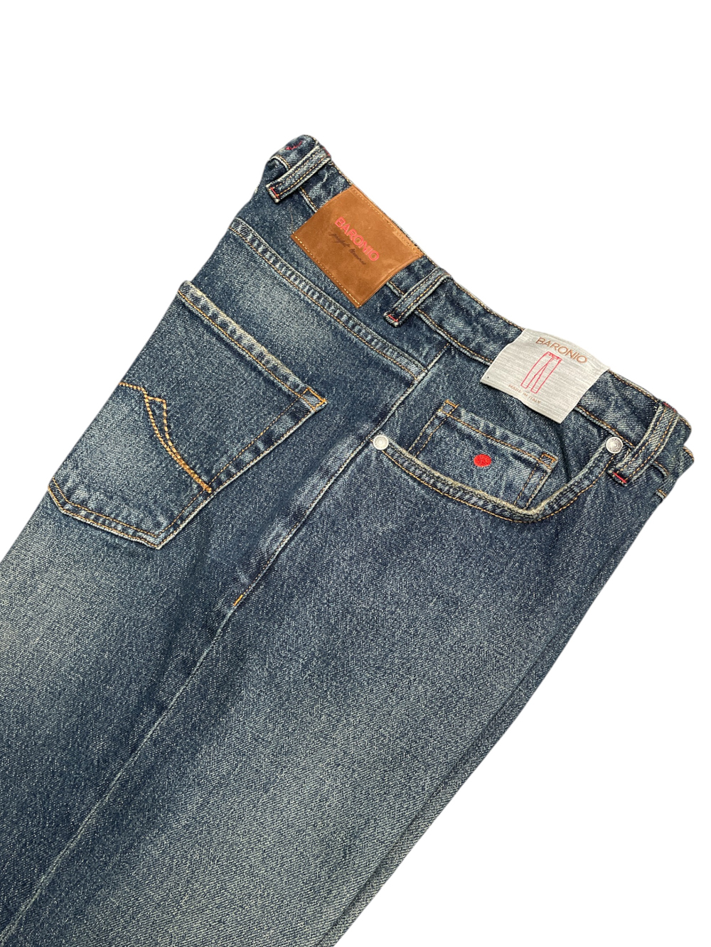 Denim 5 tasche, sanblasted wash, cuciture color tabacco, passanti per cintura, salpa marrone in pelle scamosciata con logo baronio, chiusura con zip, regular fit.