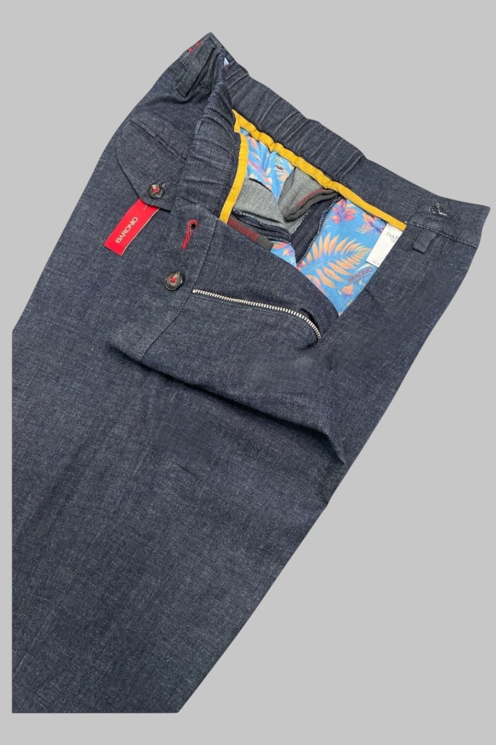 € 135,00 -40% € 81,00Denim 5 tasche, dark blu, cuciture di colore tabacco, passanti per cintura, salpa marrone in pelle scamosciata con logo baronio, chiusura con zip, regular fit.