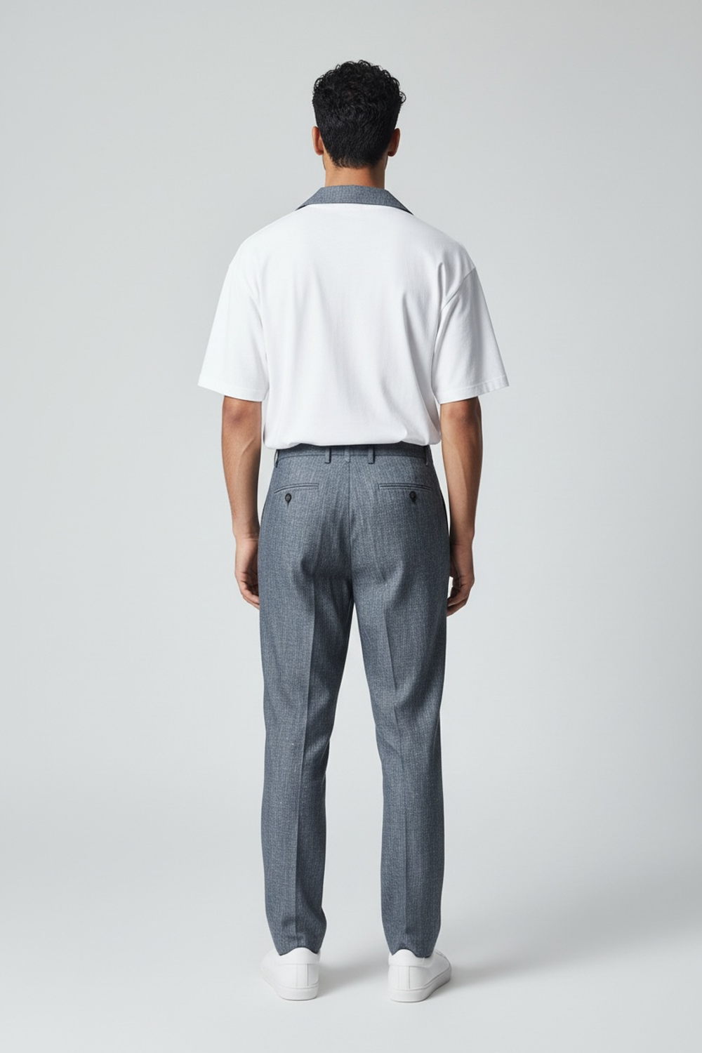 Jeans dal taglio sartoriale con doppia pinces in misto denim lino, tasche posteriori a filetto con bottoni, chiusura con cerniera, comfort fit.