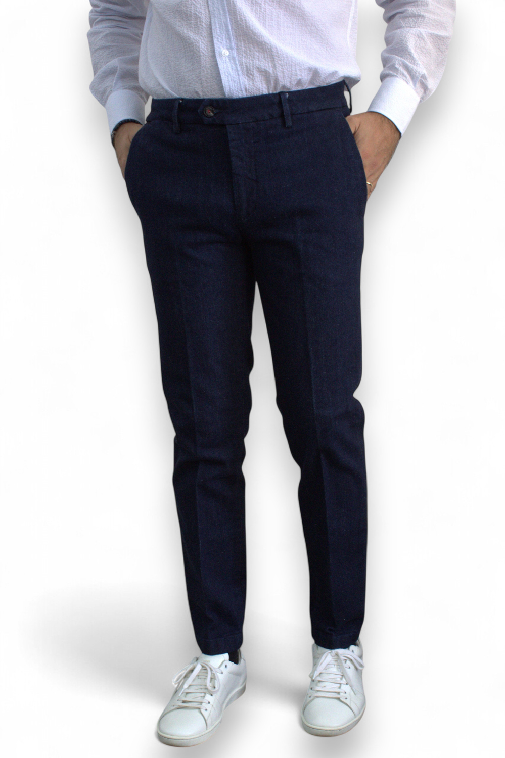Jeans tasca america, tasche posteriori senza bottoni, passanti per cintura, chiusura con zip, slim fit.