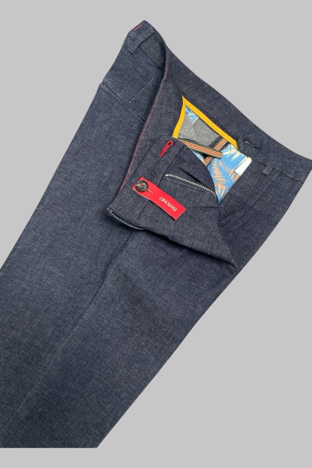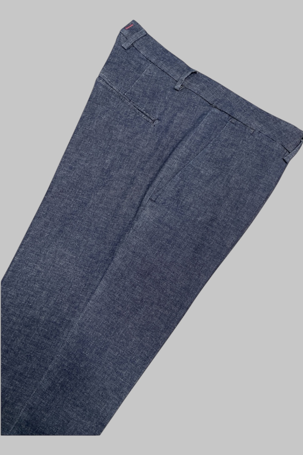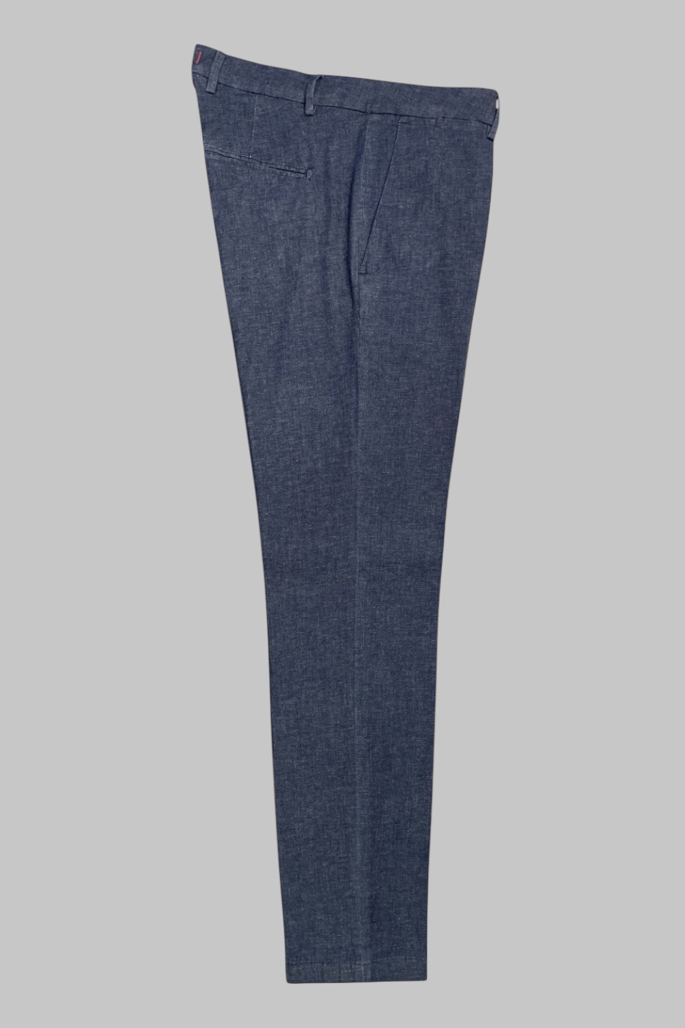 Prodotto realizzato in denim chambray modello tasca america, presenta tasche laterali oblique, tasche posteriori a filetto senza bottoni, passanti per cintura, chiusura con cerniera, slim fit.
