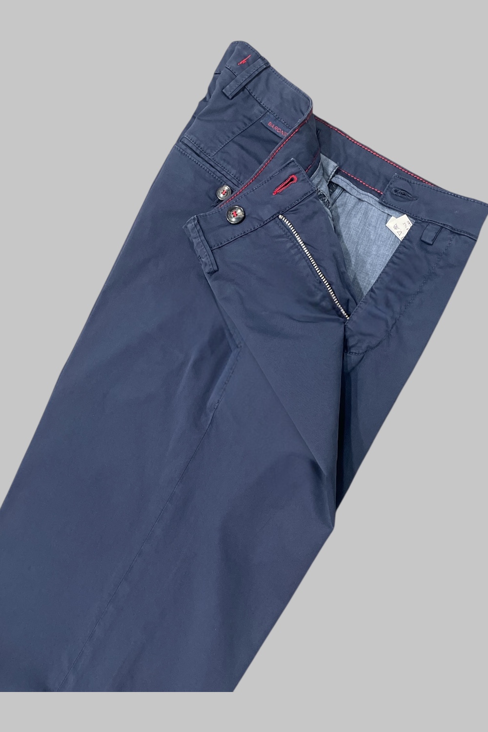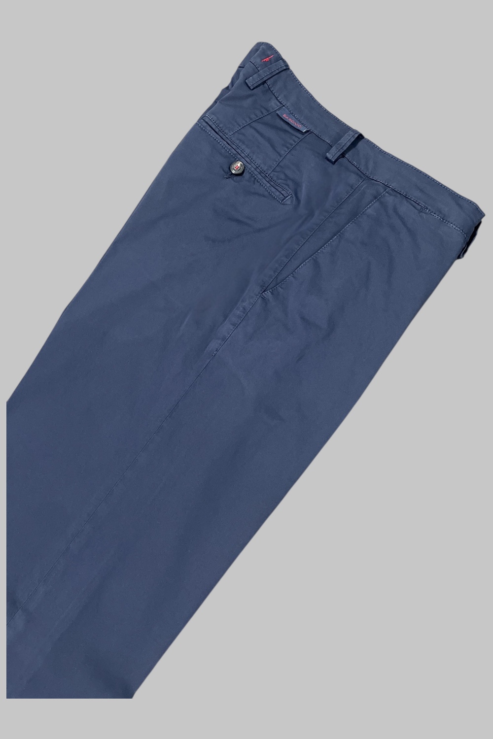 € 125,00Pantalone comfort fit tasca america con elastico in vita. Tasche posteriori con pattine, chiusura centrale con zip, passanti per cintura e comfort fit.