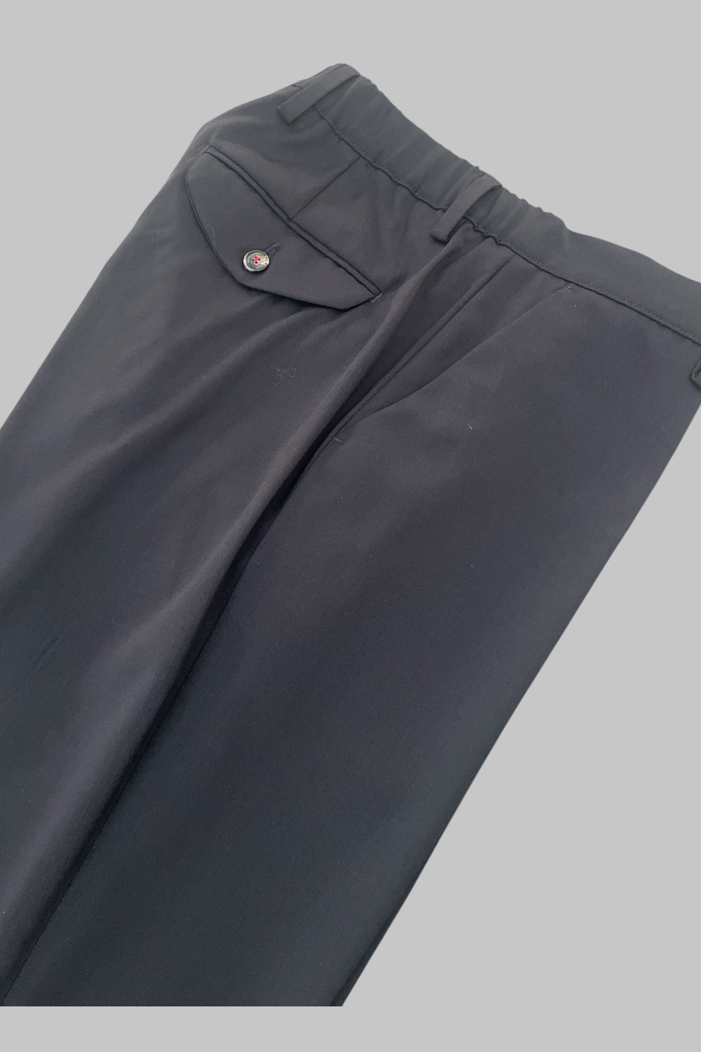 € 140,00Pantalone comfort fit tasca america con elastico in vita. Tasche posteriori con pattine, chiusura centrale con zip, passanti per cintura e comfort fit.