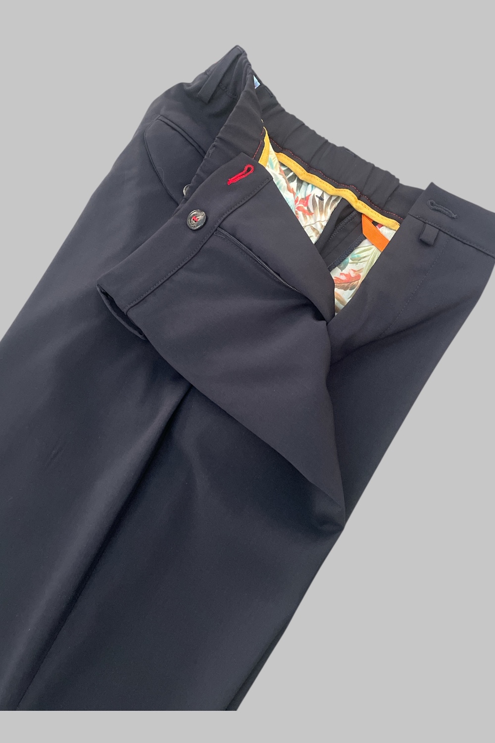 € 155,00Pantalone comfort fit tasca america con elastico in vita. Tasche posteriori con pattine, chiusura centrale con zip, passanti per cintura e comfort fit.