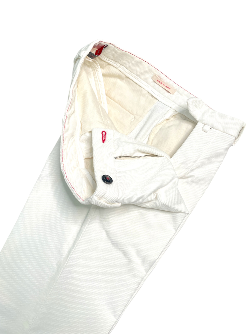 Questo pantalone è realizzato in 98% cotone e 2% elastan tex cotone 1000 righe. Presenta un design a tasca america, una chiusura centrale con cerniera, passanti per cintura e tasche posteriori sul retro a filetto. Il capo ha un fit slim. Il colore è una tonalità di bianco.