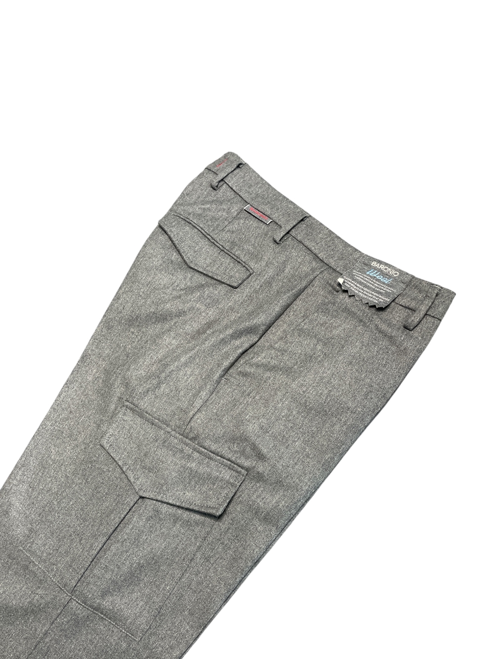 Pantalone tasca america, elastici laterali e passanti per cintura, tasche laterali con pattine e bottoni, due tasche posteriori a filo con asola e bottone, tasconi laterali, comfort fit.