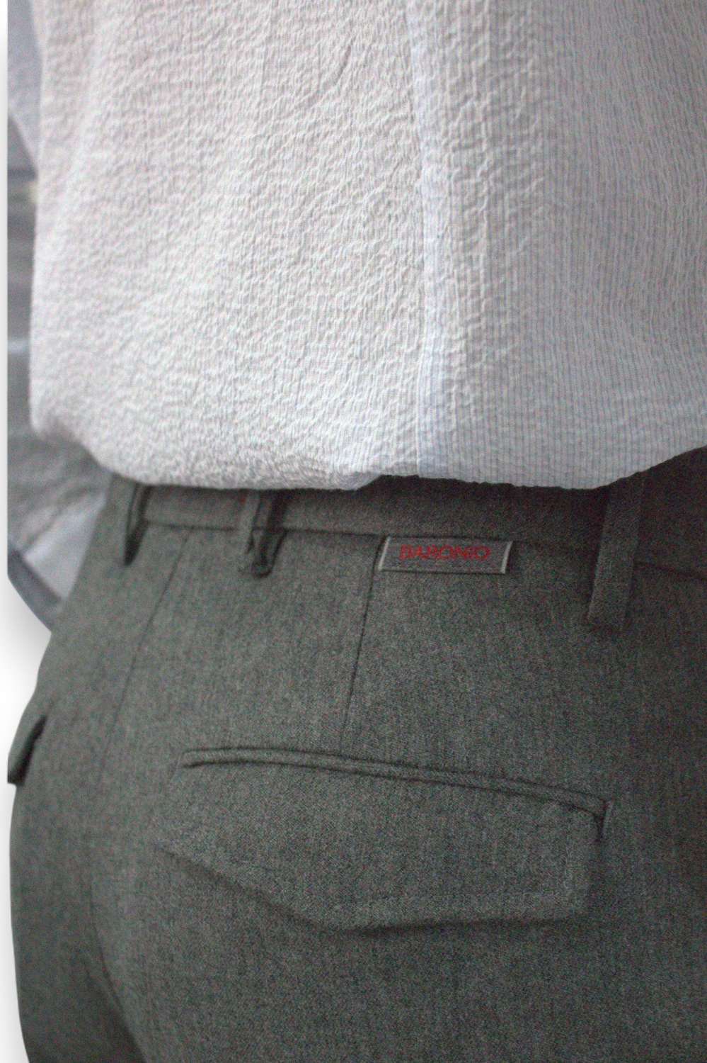 Questo pantalone è realizzato in 54% lana vergine, 17% viscosa, 27% poliestere e 2% elastan flanella di lana leggera. Presenta un design a tasca america con cintura sartoriale, una chiusura centrale con bottone e cerniera, passanti per cintura e tasche posteriori a filetto sul retro. Il capo ha un fit regular. Il colore è una tonalità di grigio chiaro.