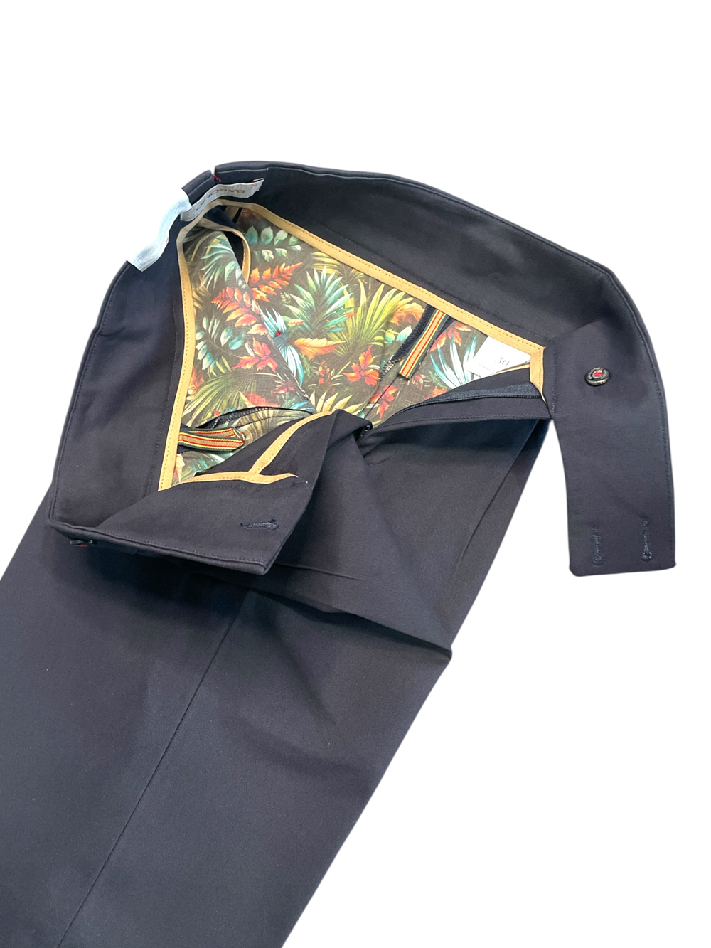 Questo pantalone è realizzato in 98% cotone e 2% elastan velluto liscio. Presenta un design a tasca america, una chiusura centrale con cerniera, passanti per cintura e tasche posteriori a filetto. Il capo ha un fit slim. Il colore è una tonalità di blu navy.