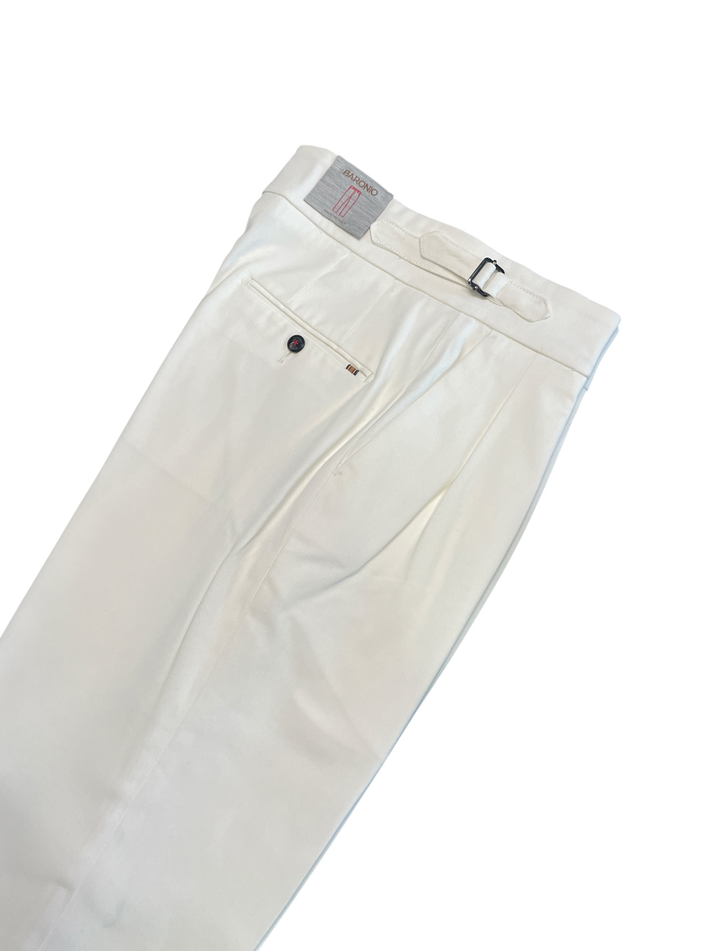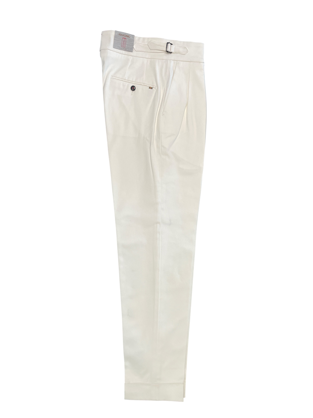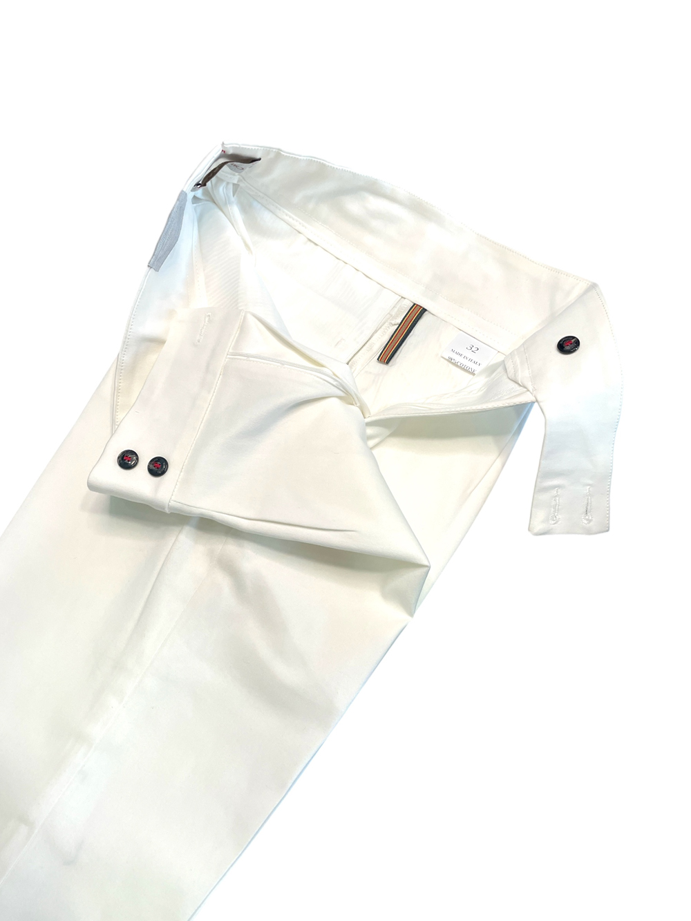 Questo pantalone è realizzato in 98% cotone e 2% elastan tex cotone 1000 righe. Presenta un design a tasca america, una chiusura centrale con cerniera, passanti per cintura e tasche posteriori sul retro a filetto. Il capo ha un fit slim. Il colore è una tonalità di bianco.