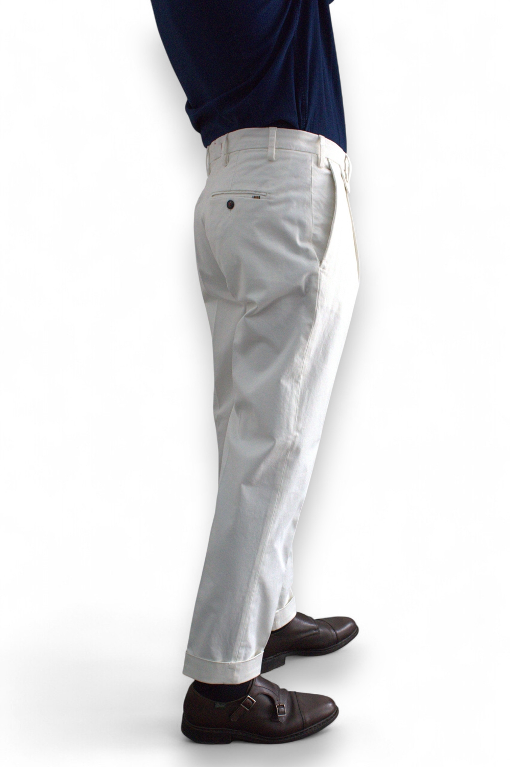Questo pantalone è realizzato in 97% cotone e 3% elastan gabardine. Presenta un design a tasca america, una chiusura con fibbie laterali e bottoni e tasche posteriori a filetto con bottoni. Il capo ha una vestibilità regolare. Il colore è una tonalità di bianco.