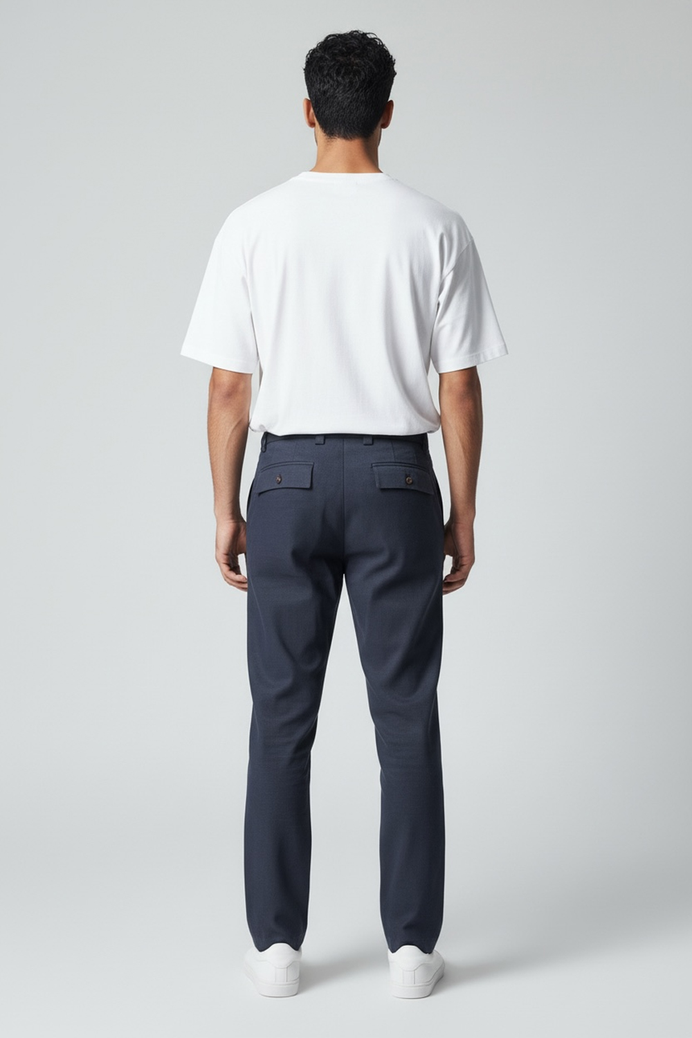€ 145,00Pantalone comfort fit tasca america con elastico in vita. Tasche posteriori con pattine, chiusura centrale con zip, passanti per cintura e comfort fit.