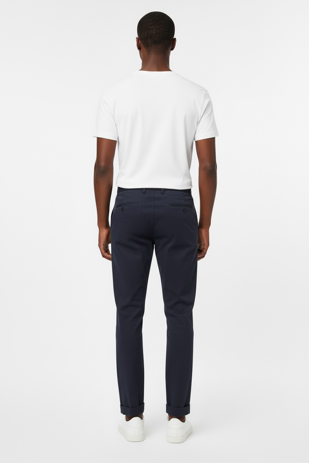 Pantalone tasca america con pinces e risvolto sul fondo dal taglio sartoriale, tasche posteriori a filetto con bottoni, chiusura con cerniera, comfort fit.